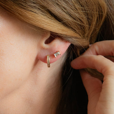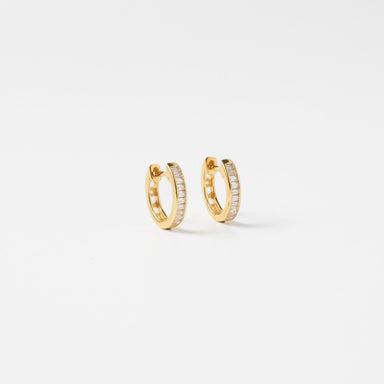 Dainty, feminine, effortless sparkle - the Baguette Huggies feature a row of baguette-cut CZs along the front of the hoop. With their smooth hinged...