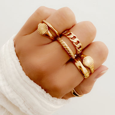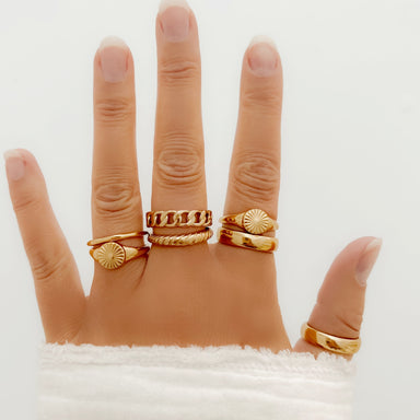A bold chunky chain-link ring that can easily mix + match with all Sugar Blossom rings! Materials:• Stainless steel plated in 14k Gold Details:• A...