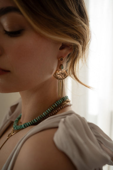 A staff favourite, the Delphi Earrings strike a balance between boldness and elegance. Faceted Copper Rutilated Quartz studs anchor the design, whi...