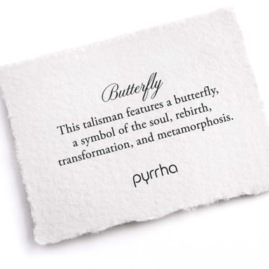 This talisman features a butterfly, a symbol of the soul, rebirth, transformation, and metamorphosis. Pyrrha signature talismans are handcrafted us...