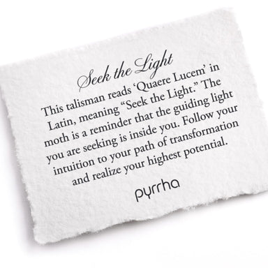 This talisman reads ‘Quaere Lucem’ in Latin, meaning ‘Seek the Light.’ The moth is a reminder that the guiding light you are seeking is inside you...