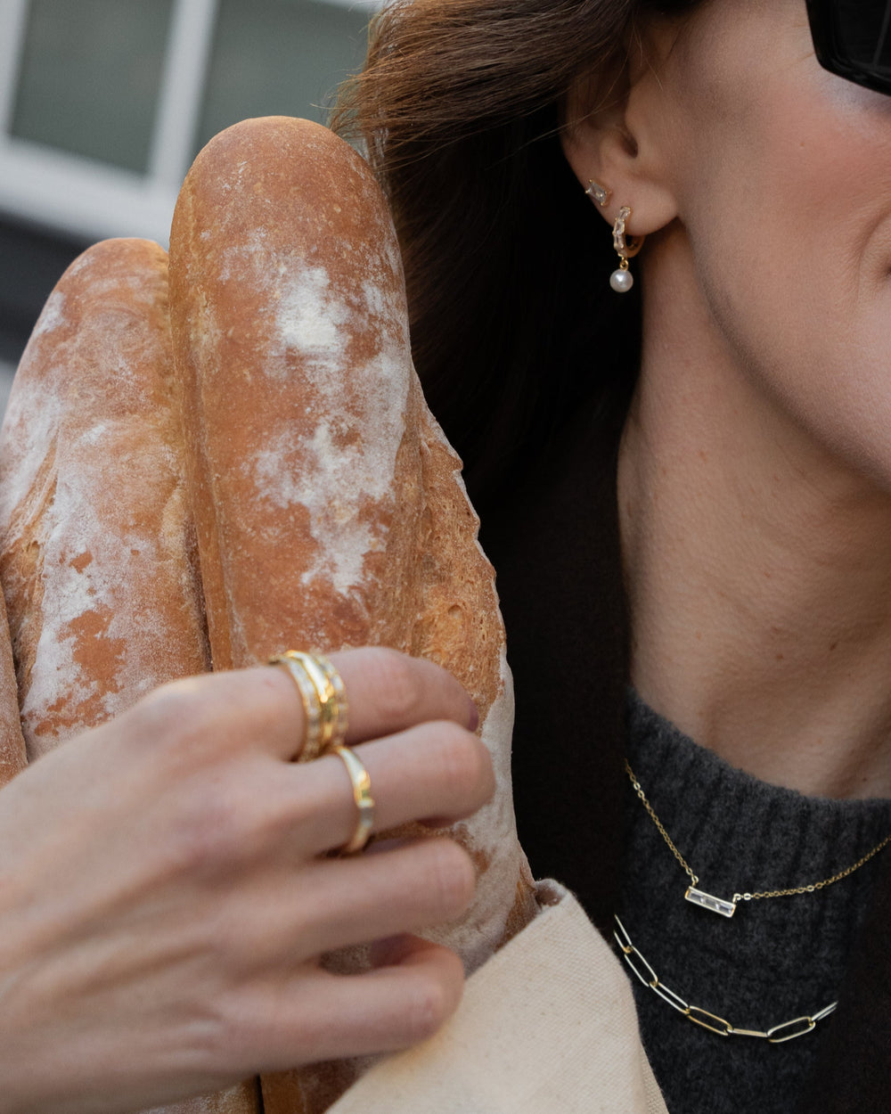 The model pictured is wearing the the Amara Pearl Huggies with the Mae Studs, the Petite Baguette Necklace, and the Roberts Paperclip Chain Necklace