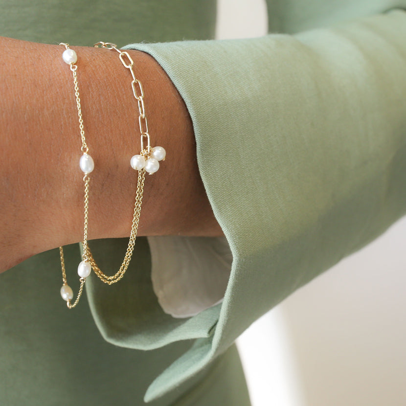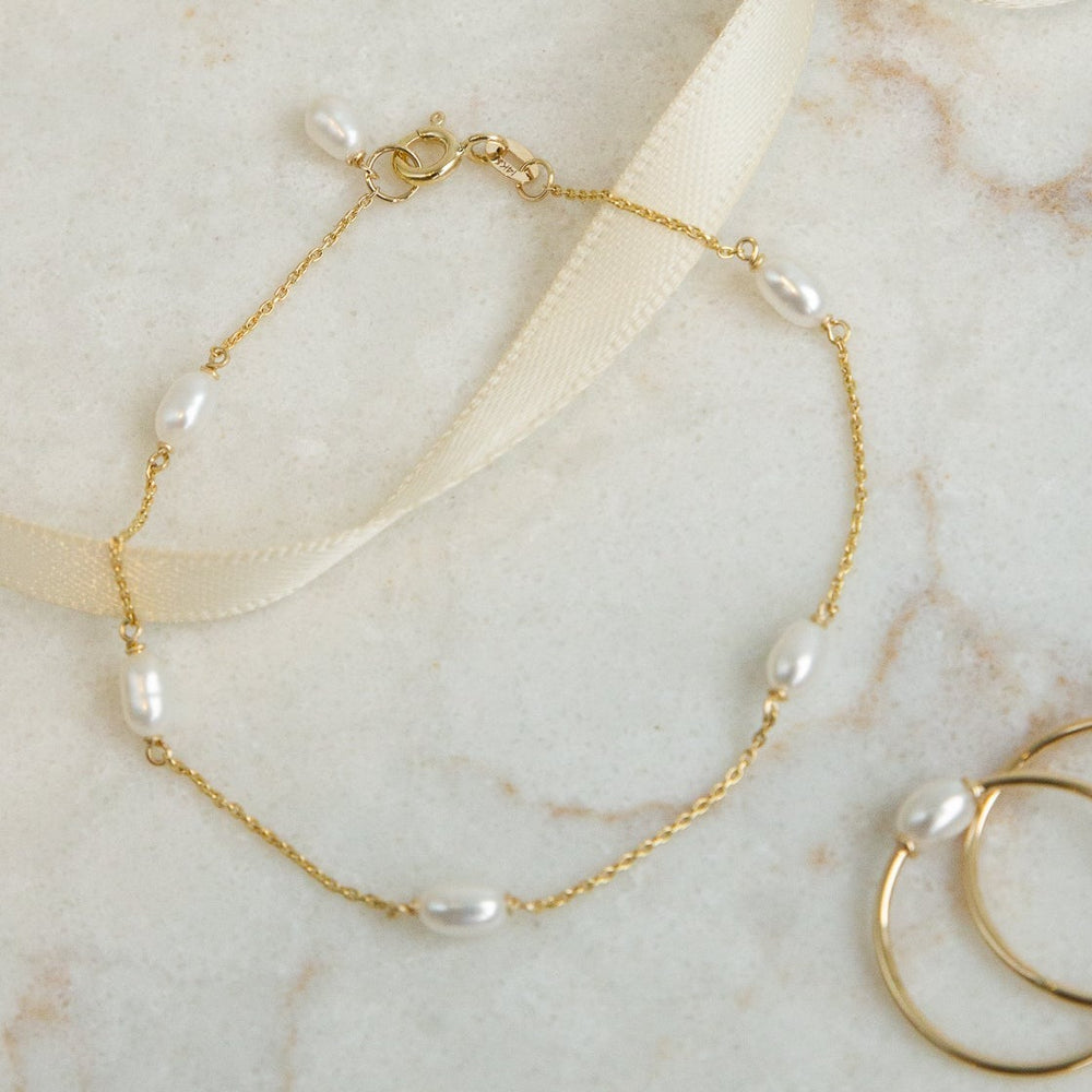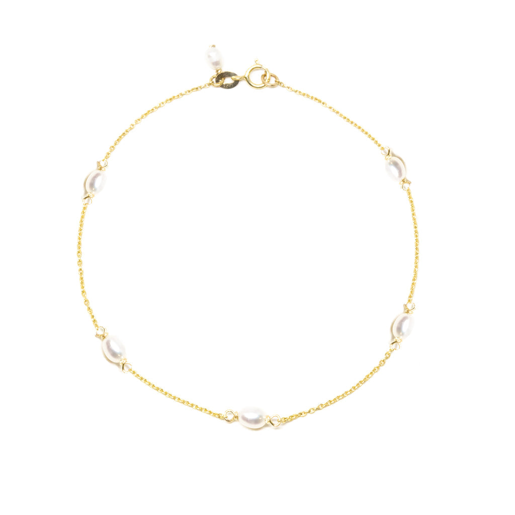 Organically shaped pearls celebrate the beauty of individuality, authenticity and imperfection. Six small oval-shaped keshi pearls scattered throughout a delicate 14k gold chain in this pretty, and understated bracelet.