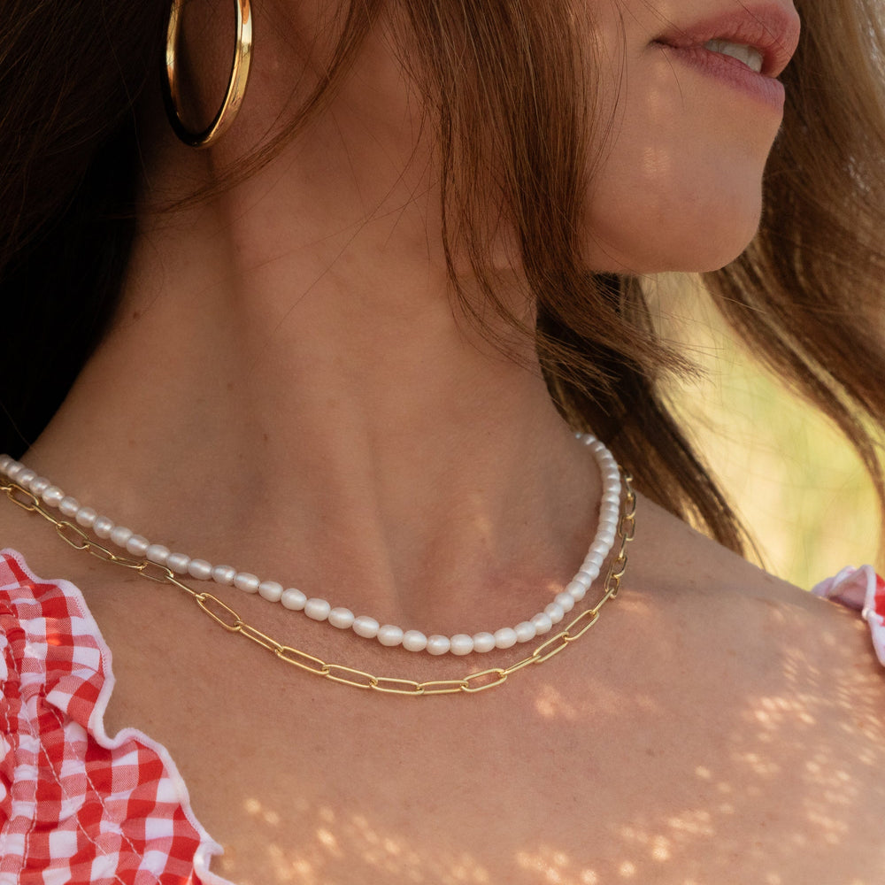 The first model pictured are wearing the Perla Necklace layered with the Roberts Paperclip Chain Necklace, The Perlina Necklace, and the Roma Necklace.