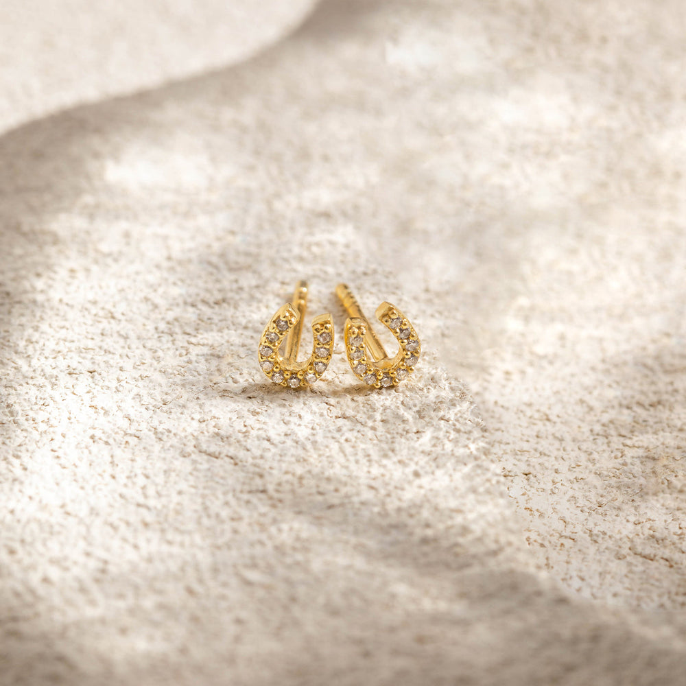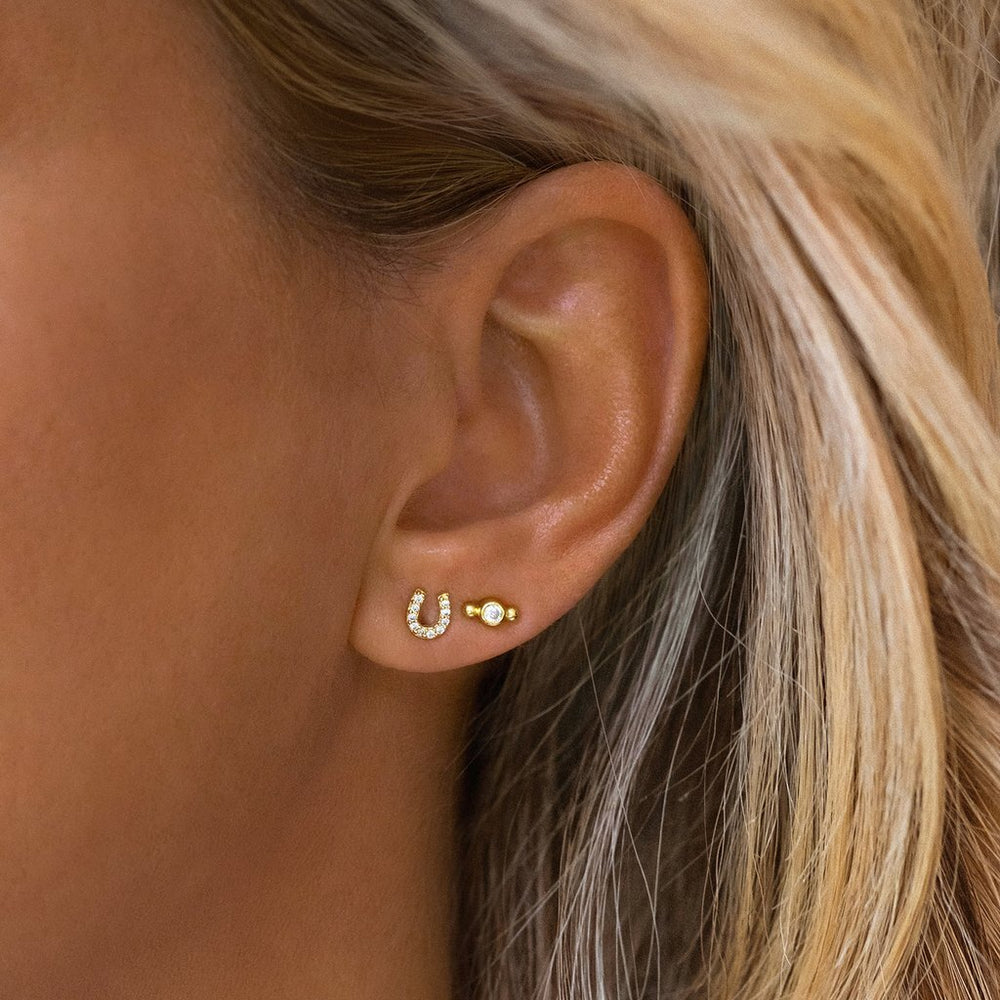 Bring some luck onto your lobes with these tiny horseshoe studs. Dainty gold horseshoes topped with tiny CZ’s make for a modern take on a classic symbol. Pair with the Tiny Horseshoe Necklace for a little bit of luck all over.