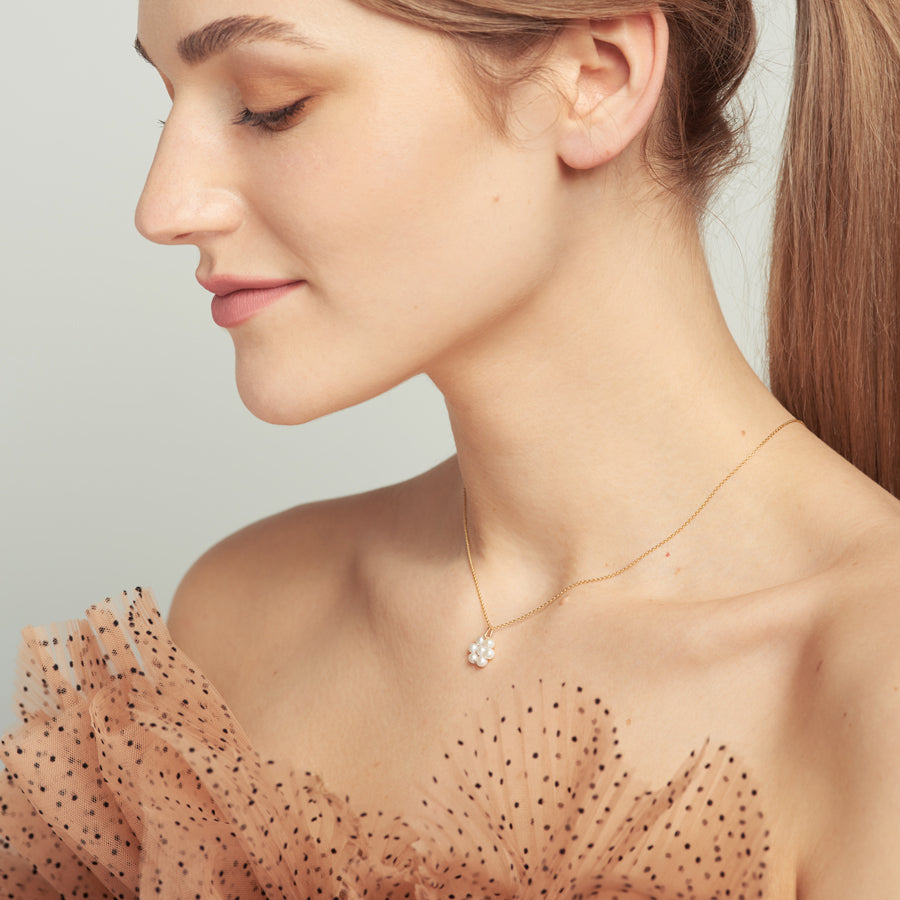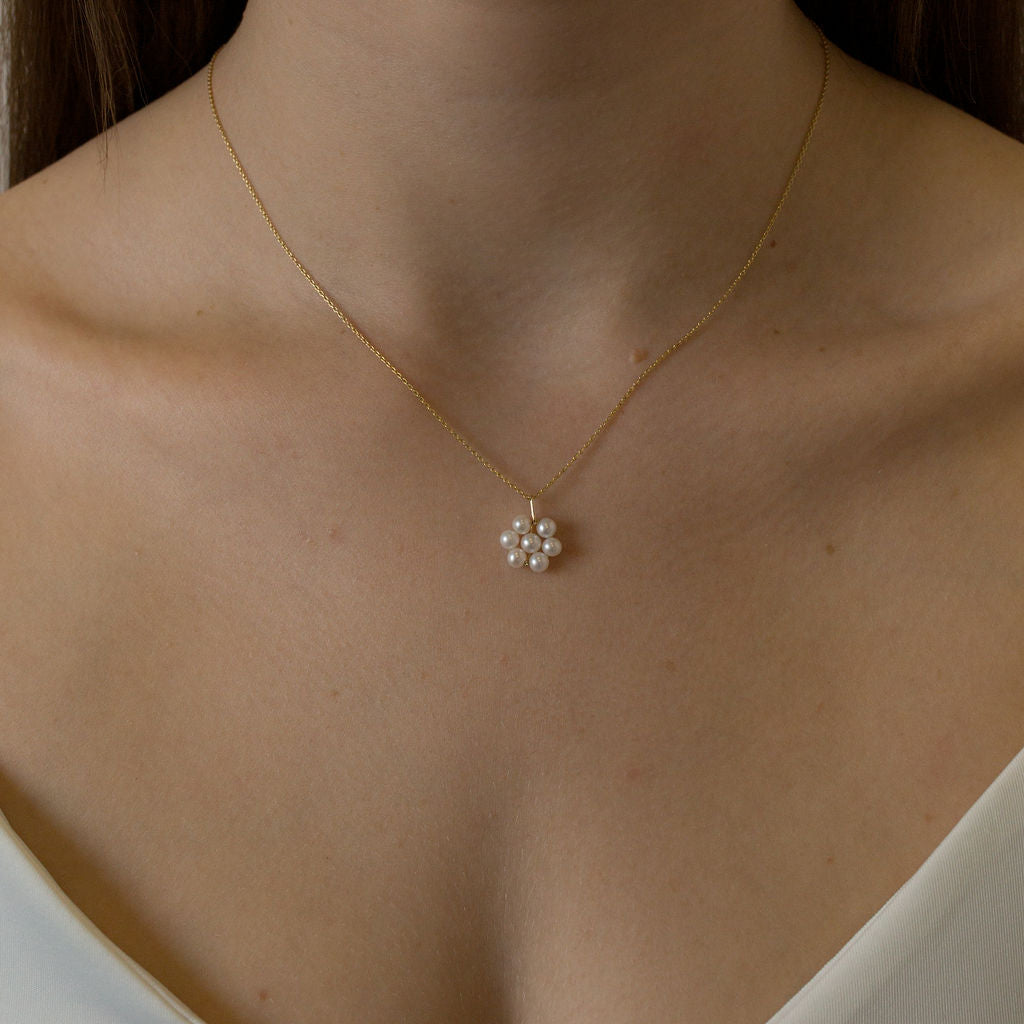This Pearl Flower Pendant Necklace is an exquisite piece of jewelry, crafted from luxurious 14k gold and featuring an elegant cluster of pearls. This pendant will add a touch of subtle glamour to any occasion.